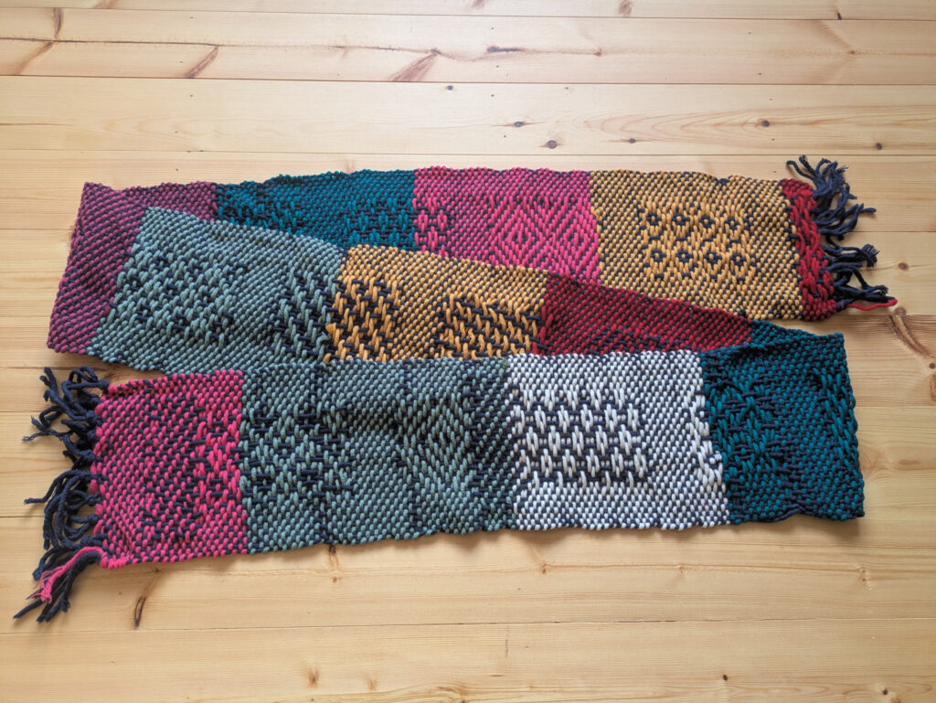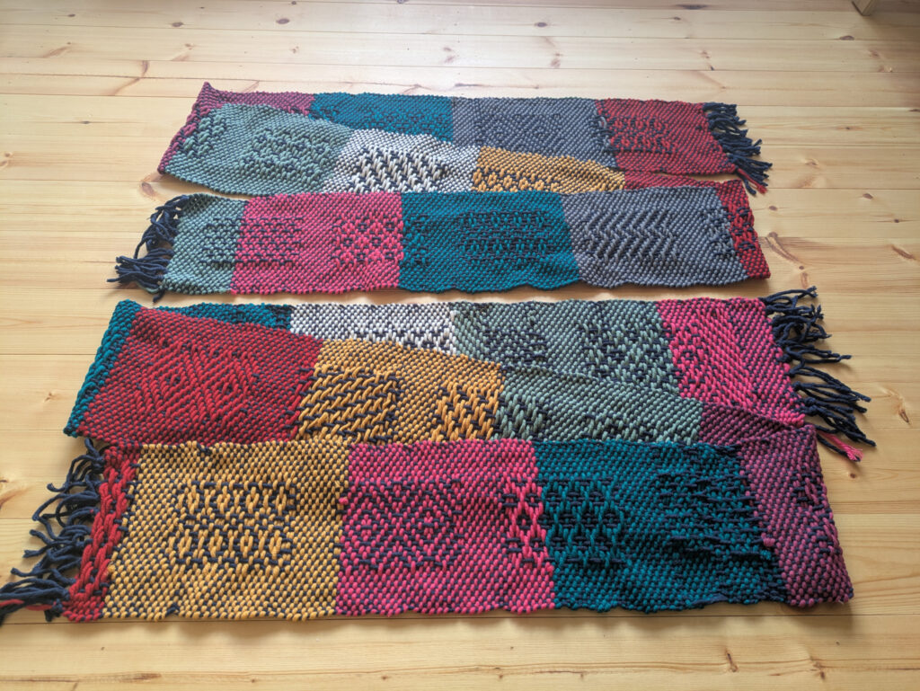 The loom didn’t quite finish the scarf during the event. As can be seen from the photos, above, there is still a little warp yarn left on the bobbins. I shall complete the scarf over the next couple of days and post an update with photos of the scarf and a link to the eBay auction then.